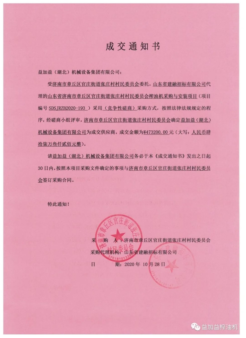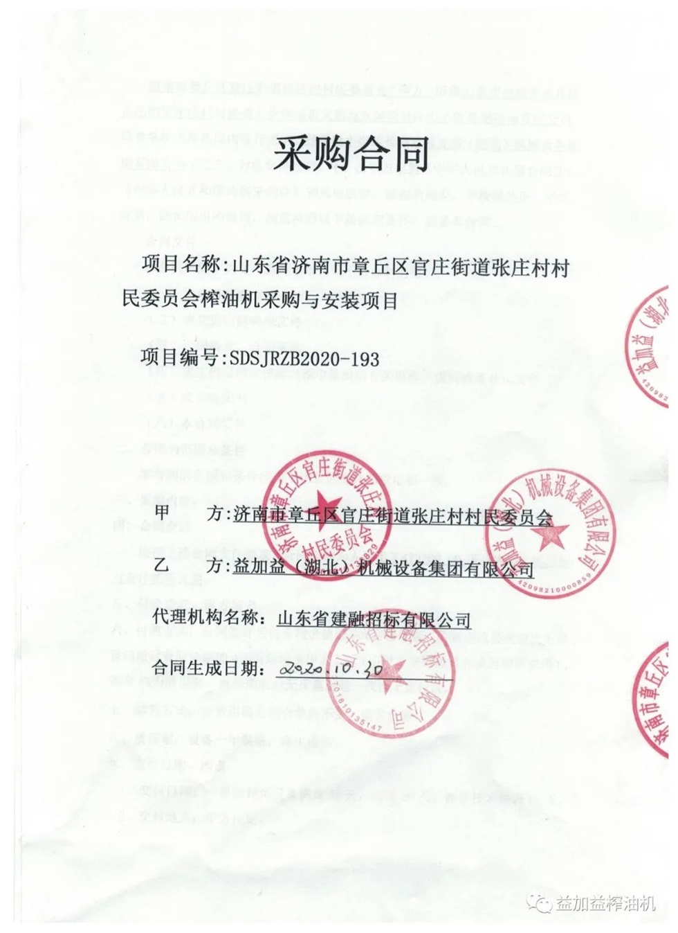 最近、益加益集團在山東省濟南市章丘區榨油機采購與安裝招標項目的競標中,憑借過硬的產品質量,優秀的新技術,卓越的新工藝,新材料的應用以及良好的企業信譽,以絕對優勢順利中標。